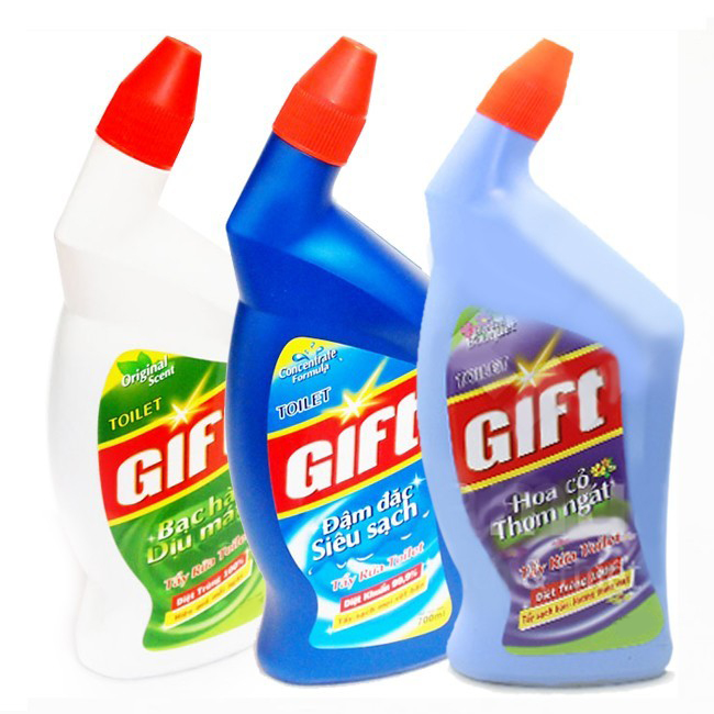 - Nước tẩy rửa toilet Gift đậm đặc siêu sạch 600ml (Xanh) với công thức tẩy rửa cực mạnh, giúp tẩy sạch mọi vết bẩn, vết ố vàng, diệt trùng, khử mùi hôi khó chịu giúp bồn cầu luôn sạch bóng.